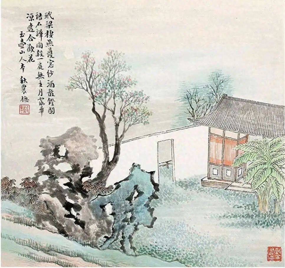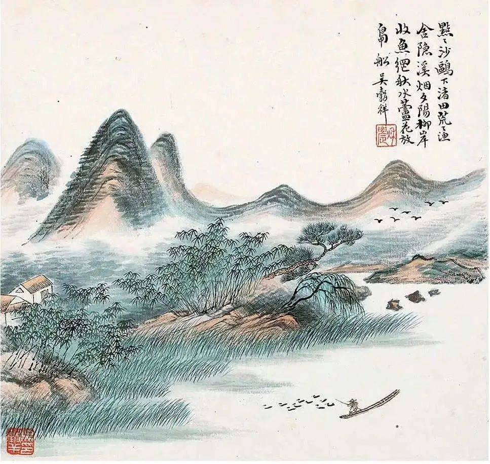 吴谷祥画山石,那叫一个“硬核”,细笔勾勒,皴擦点染,山石苍浑厚重,仿佛能摸到石头的棱角。画草木,繁密茂盛,绿意盎然,让人感觉置身于山林之中,呼吸都变得清新起来。更绝的是他的设色,浅绛青绿,清丽脱俗,翠黛之色跃然纸上,就像给山水披上了一层薄纱,美得让人心醉。