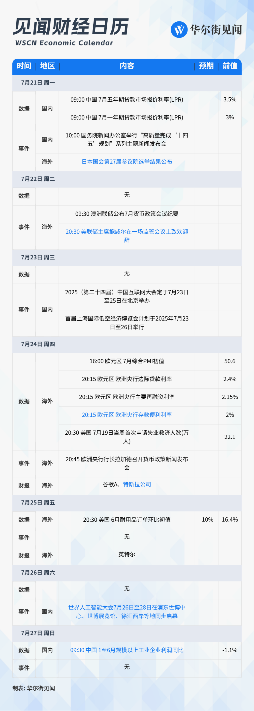 重点关注:日本第27届参议院选举公布最终结果、上海举办世界人工智能大会与低空经济博览会、特斯拉公布25财年第二季度财报、美联储主席鲍威尔将在一场会议上致欢迎辞。